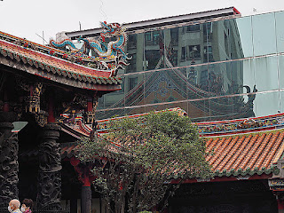 The section of Taipei we visited used to be called Bang-ga and was one of the first areas developed by Qing Dynasty Chinese from Fujian Province 270 years ago. Built originally in 1738, the Lungshan Temple is associated with a mother temple in Fujian. Wife and I were taken by both the large number of people visiting not just for tourism but to do devotional respects and its incredible architectural detail.